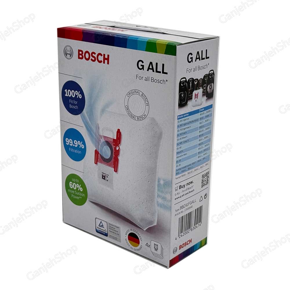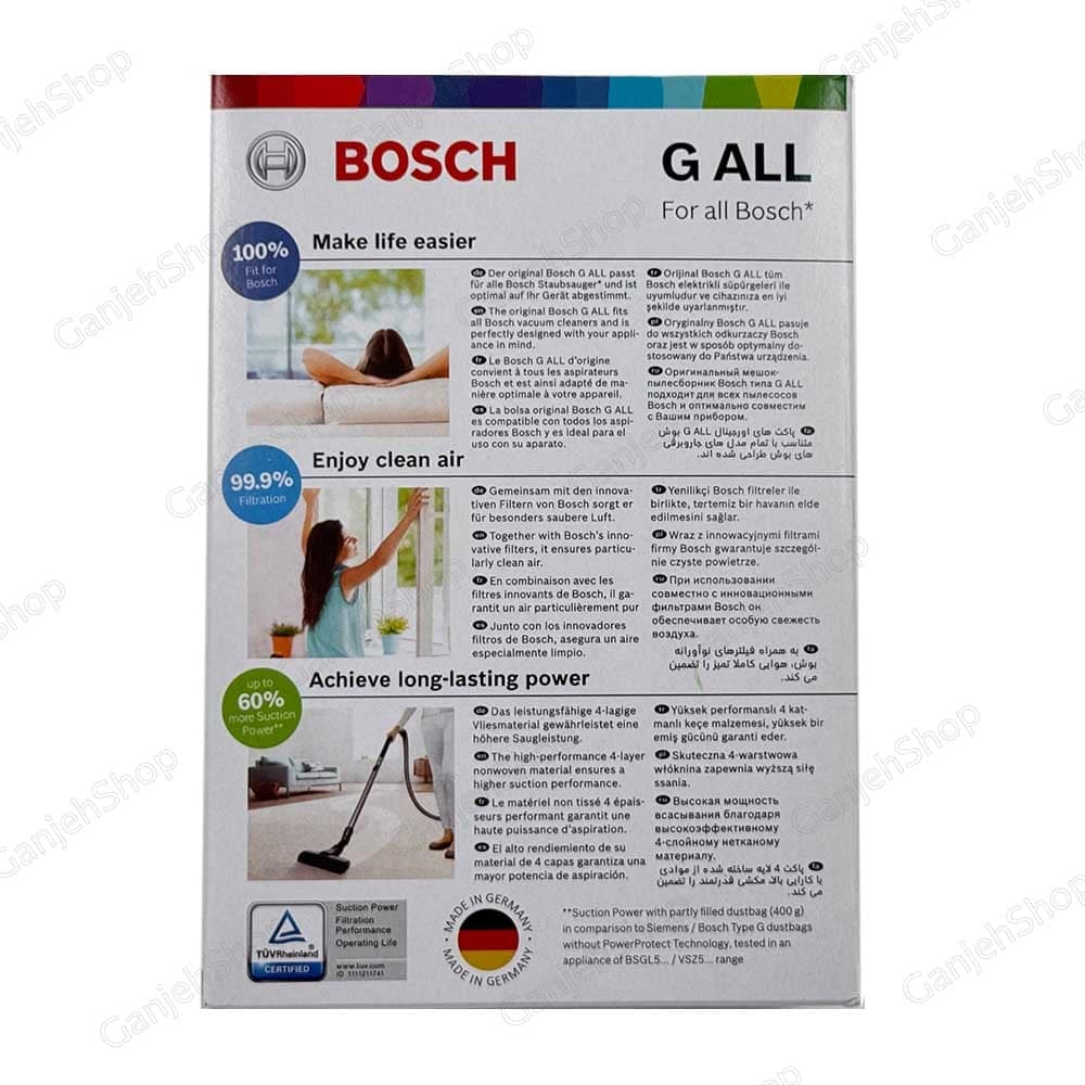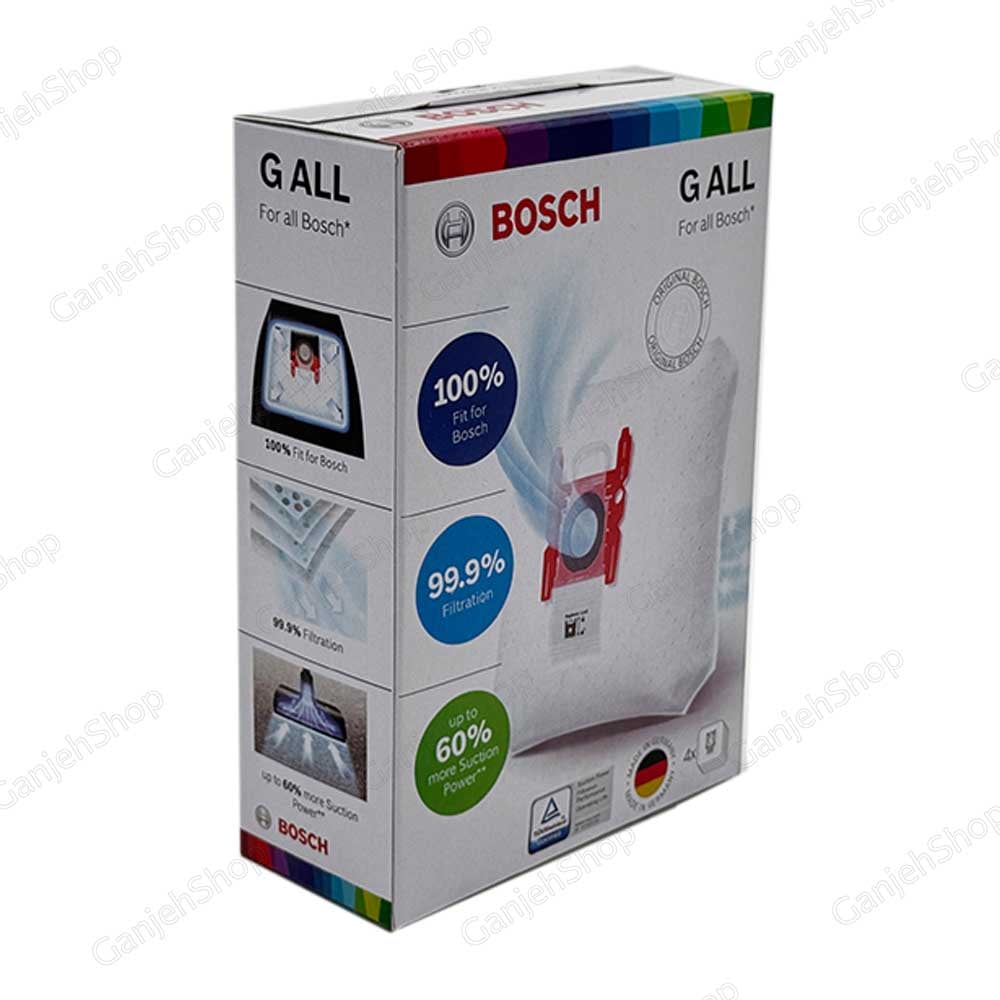 این محصول پک 4 عددی پاکت G ALL بوش میباشد. این مدل از پاکت جاروبرقی بوش به عنوان با کیفیتترین و خاص ترین مدل پاکت G ALL جاروبرقی بوش در جهان شناخته میشود. این کیسه جاروبرقی بوش ساخت کشور آلمان بوده و بالاترین گرید کیفیتی را دارا میباشد. تا 99 جذب گرد و خاک به خود را دارد و به علت بافت نانو درجه یک، تا 60 درصد مکش جاروبرقی را افزایش میدهد. در این پک 4 عدد پاکت وجود دارد. این پاکت بخصوص برای کسانی که در منزل حیوانات خانگی نگهداری میکنند بسیار توصیه میشود به علت اینکه جذب داخلی این پاکت بسیار بالا میباشد.